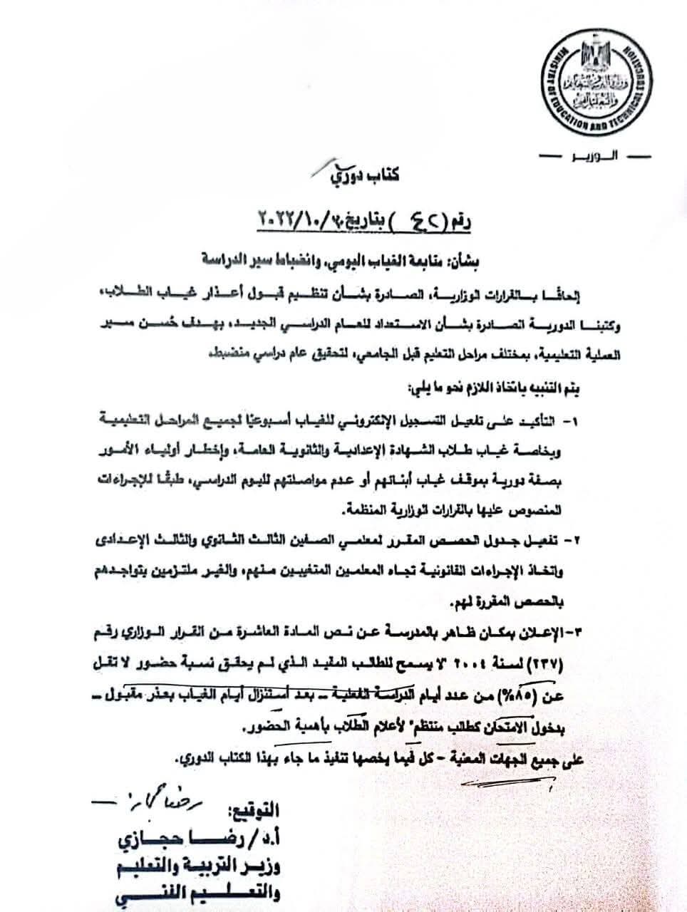 وتنفيذا لتعليمات الأستاذ محمد عبد اللطيف وزير التربية والتعليم والتعليم الفني