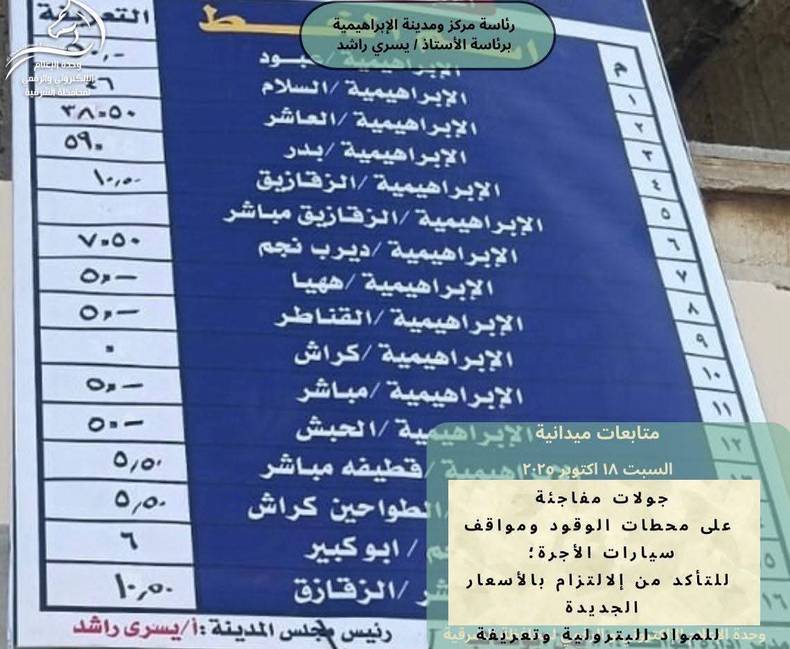 أكد محافظ الشرقية أن المحافظة لن تتهاون مع أي مسؤول يثبت تقصيره في تنفيذ التعليمات الصادرة ، مشددًا على ضرورة الإلتزام الكامل بالتعريفة الجديدة ومنع أي استغلال للمواطنين.