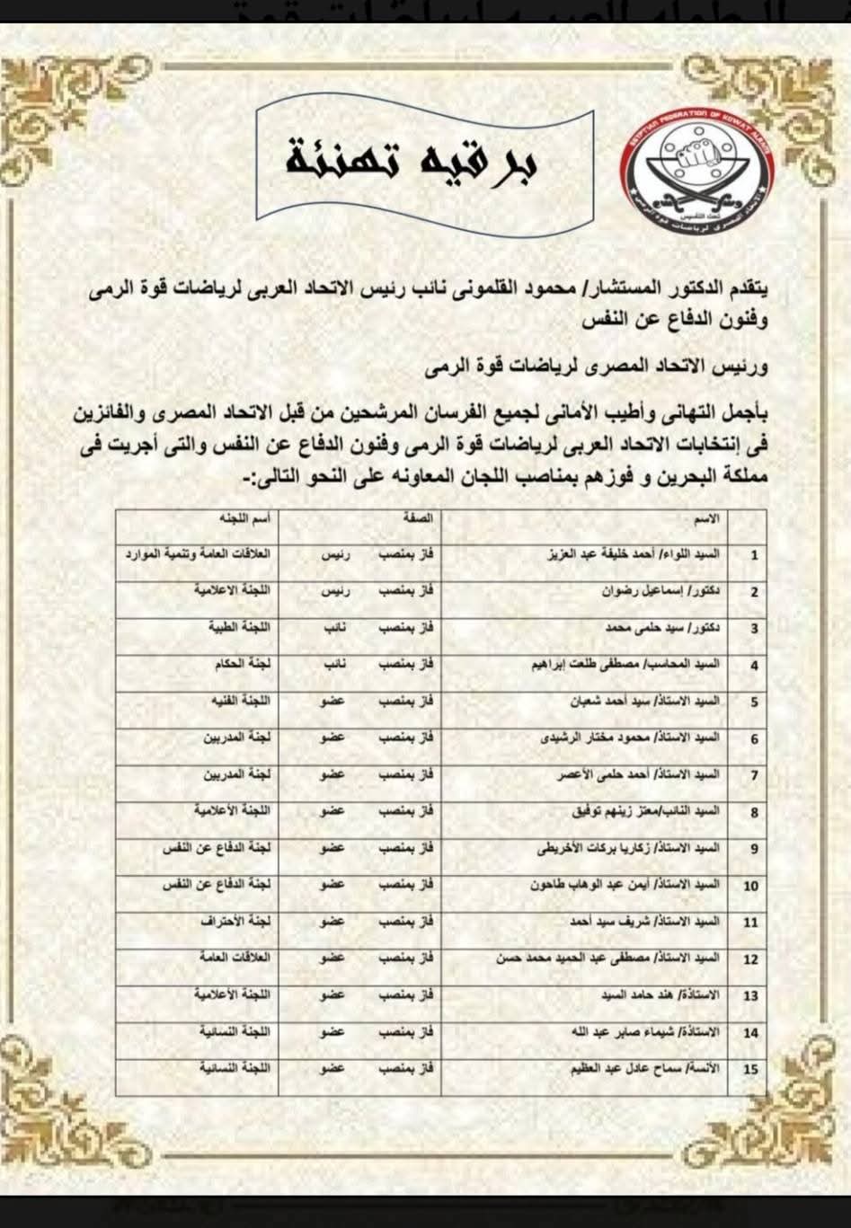 حقق المنتخب المصري لرياضات قوة الرمي تحت التأسيس نجاحًا مميزًا في البطولة العربية المقامة في البحرين خلال الفترة من 12 إلى 17 نوفمبر، بعد مشاركته ببعثة ضمت كابتن مصطفى حسن رئيسًا للبعثة، والمدرب كابتن إسماعيل رضوان، واللاعبين: محمد زايد، سيد أحمد شعبان، محمد إسلام، محمد هيثم محمد، مالك محمد تومة، محمد فوزي، وتسـنيم حلمي محمود.