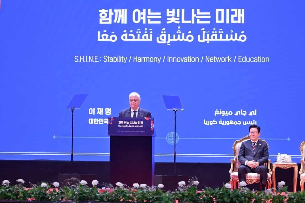 كما أشار الرئيس الكوري إلى مبادرة SHINE والتي تشمل ثلاثة مجالات تتمثل في السلام والازدهار والثقافة وفتح مستقبل مشرق للشرق الاوسط وشبة جزيرة كوريا لتحقيق الاستقرار وأن الحكومة الكورية ساهمت بشكل مباشر في إرساء السلام داخل الشرق الأوسط، معلنًا عن تقديم كوريا مساهمات بمقدار ١٠ ملايين دولار للهلال الأحمر المصري واتفاقه مع فخامة الرئيس عبد الفتاح السيسي علي المشاركة في إعادة الاعمار داخل قطاع غزة مؤكدًا حرصه على تحقيق مستقبل أكثر ازدهارًا من خلال الابتكار المشترك ودفع التنمية الاقتصادية