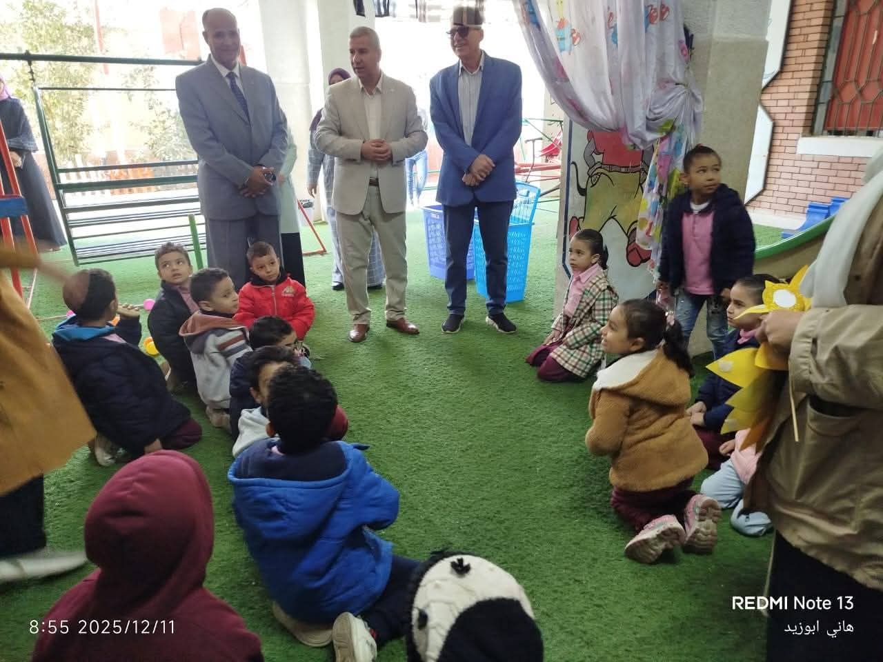 وحرص سيادته علي تفقد قاعات رياض الاطفال ووجه بممارسة ساعة يوميا من النشاط الحركي الحر لمرحلة رياض الاطفال في فناء المدرسة