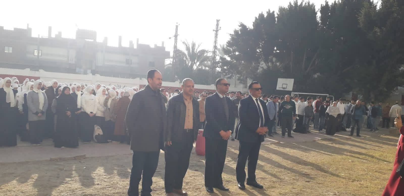 جاء ذلك للوقوف علي انتظام سير العملية التعليمية ويشارك طلاب مدرسة الشهيد محمد فتحي الثانوية المشتركة طابور الصباح وتأدية تحية العلم
