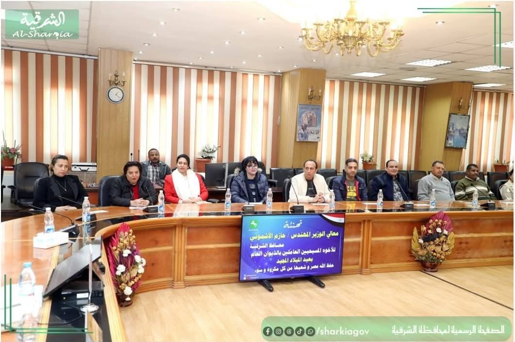 إلتقى المهندس/ حازم الاشمونى محافظ_الشرقية ، الإخوة المسيحيين من العاملين بديوان عام المحافظة والإدارات التابعة له ، لتهنئتهم بعيد الميلاد المجيد ، فى مشهد حضارى يدلل على عمق العلاقات الإنسانية التى تجمع بين محافظ الإقليم والعاملين بالديوان العام ، جاء ذلك بحضور الأستاذ الدكتور أحمد عبد المعطى والمهندسة لبنى عبد العزيز نائبى المحافظ ، و اللواء عبد الغفار الديب سكرتير عام المحافظة ، والعميد أركان حرب / أحمد شعبان المستشار العسكرى للمحافظة.