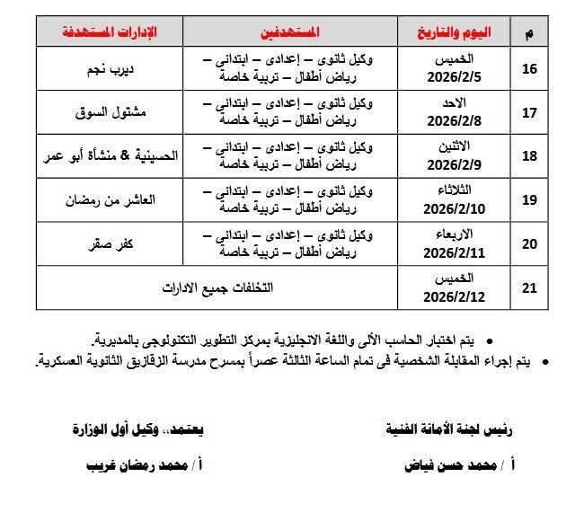 جاء ذلك لجميع المراحل وكيل ابتدائي & وكيل إعدادي & وكيل ثانوي & وكيل تربية خاصة & وكيل رياض اطفال لجميع المتقدمين من الإدارات التعليمية طبقا للجدول المرفق بمسرح مدرسة الزقازيق الثانوية العسكرية