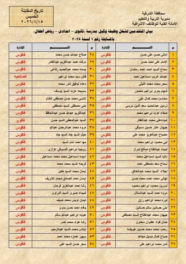 وتهيب مديرية التربية والتعليم بالشرقية علي للسادة المتقدمين لشغل هذه الوظائف والمنشورة أسماءهم الحضور في المواعيد المحددة يوم الخميس الموافق 15 يناير 2026