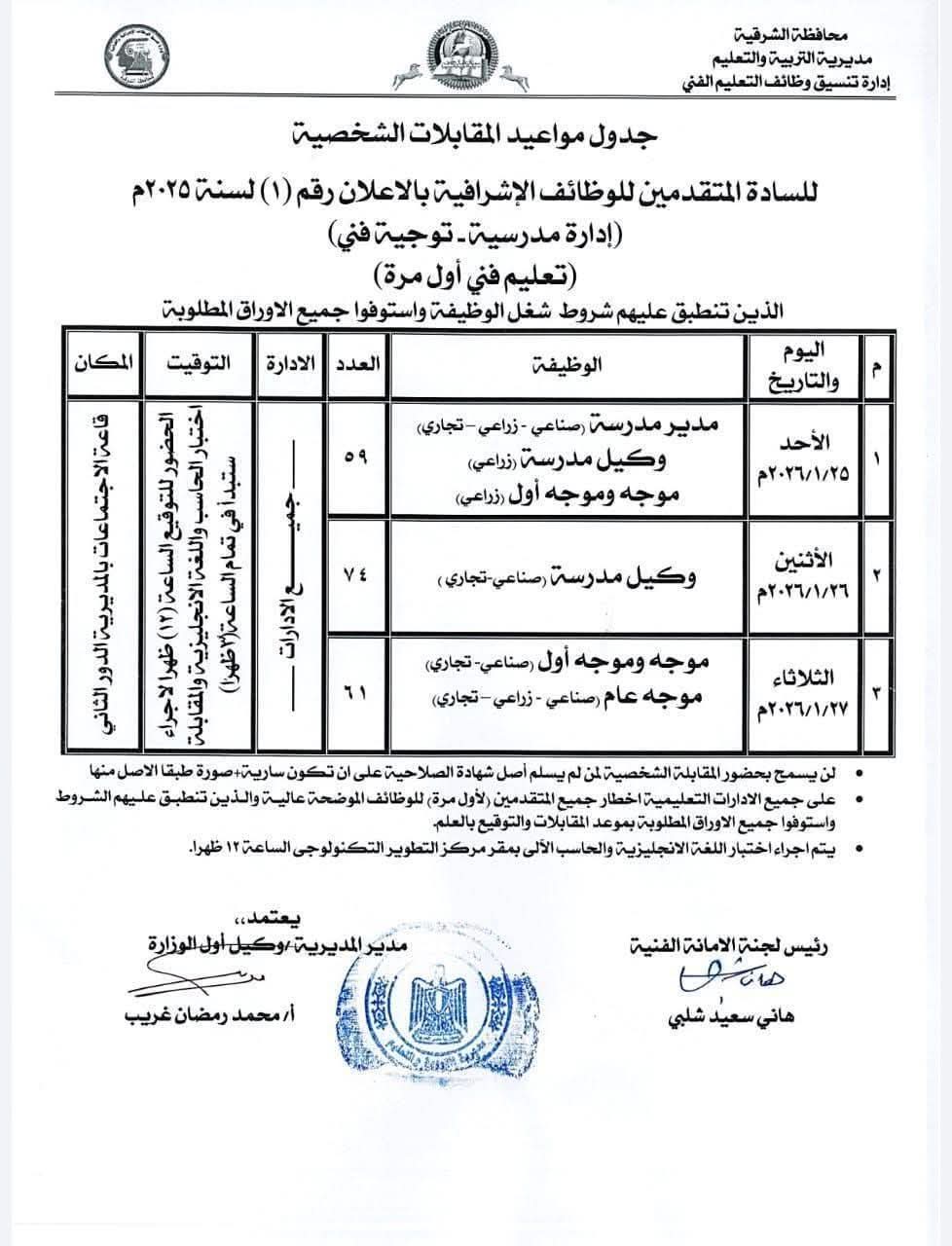 وتهيب مديرية التربية والتعليم بالشرقية علي للسادة المتقدمين لشغل هذه الوظائف والمنشورة أسماءهم الحضور في المواعيد المحددة يوم الاحد الموافق 25 يناير 2026