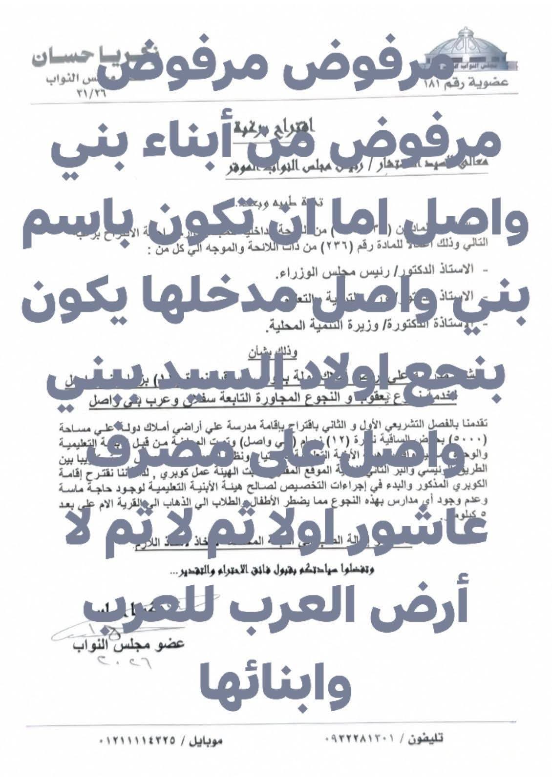 منازلنا بها وأرض أجدادنا لأبنائنا ولها مدخل عمومي على الطريق الرئيسي على مصرف عاشور بنجع اولاد السيد الغربي ببني واصل واي عمل عام ومشروعات تنميه لأبناء بني واصل وتكون باسم بني واصل ونرفض الوصايه علينا وعلى النائب احترام أبناء بني واصل وارضها وحدودها الاداريه