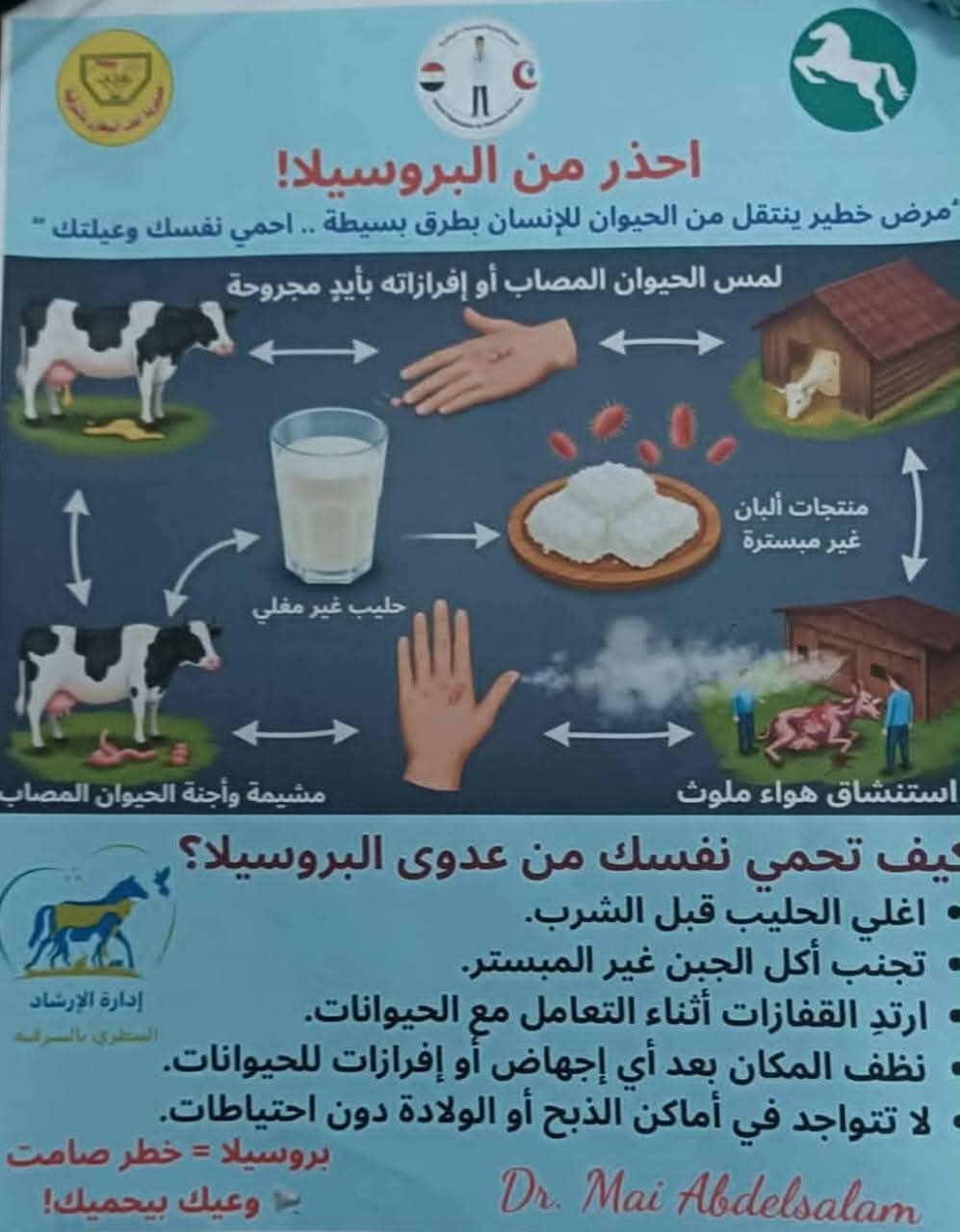 أشار وكيل وزارة الزراعة إلي أن الندوة تناولت الحديث عن مرض البروسيلا حيث أنه مرض بكتيرى خطير ينتقل من الحيوان للإنسان ولا تظهرأعراضه بالضرورة بسرعة عليه لكن في حال ظهورها تستمر لمدة عدة أشهر ومنها " حرارة - تعب مزمن - تعرق ليلى - التهاب و آلام روماتيزمية و خاصة أسفل الظهر و الركبتين " بالإضافة إلى مضاعفات أخري خطيرة .