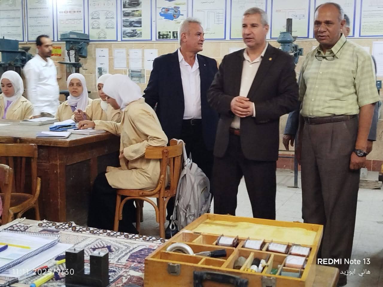 حيث تفقد سيادته فصول المدرسة واطمئن علي تحديث قوائم الفصول وتسجيلها الكترونيا وورش المدرسة والقسام العملية داخل المدرسة وشارك الطالبات بعض الحصص العملية داخل قسم التركيبات والمعدات الكهربية ثم توجه لقسم الملابس الجاهزة العملي وقسم الزخرفه والاعلان وقسم المعدات والتركيبات الكهربية