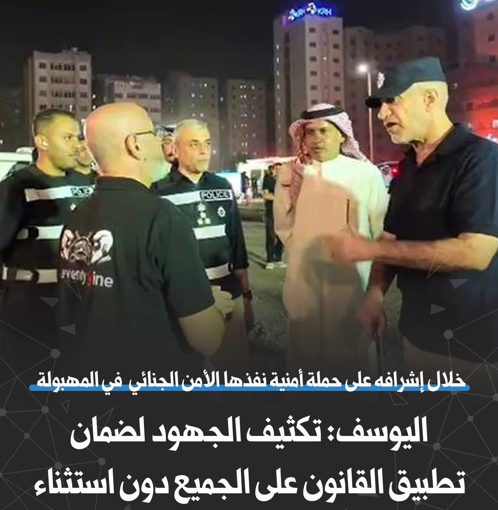 وذكرت أنه بإشراف مباشر من الشيخ فهد اليوسف، وبحضور وكيل وزارة الداخلية المساعد لشؤون الأمن العام اللواء حامد مناحي الدواس، نفّذ قطاع الأمن الجنائي حملة أمنية شاملة في منطقة المهبولة، أمس الجمعة، بمشاركة فرق أمنية ميدانية متمثلة في إدارات مباحث المحافظات وقوة الإطفاء العام والطوارئ الطبية، وذلك ضمن الجهود المستمرة لوزارة الداخلية لتطبيق القانون وضبط المخالفين والحد من السلوكيات السلبية.