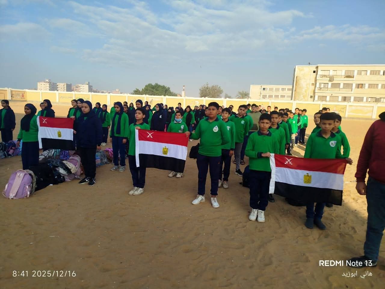 حيث شارك طلاب مدرسة الظافر للتعليم الاساسي بإدارة بلبيس التعليمية طابور الصباح وتأدية تحية العلم ويُشيد بارتفاع نسب حضور الطلاب والطالبات
